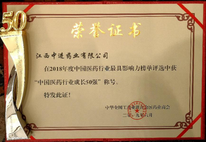 中進(jìn)藥業(yè)榮獲2018年度“中國(guó)醫(yī)藥行業(yè)成長(zhǎng)50強(qiáng)”